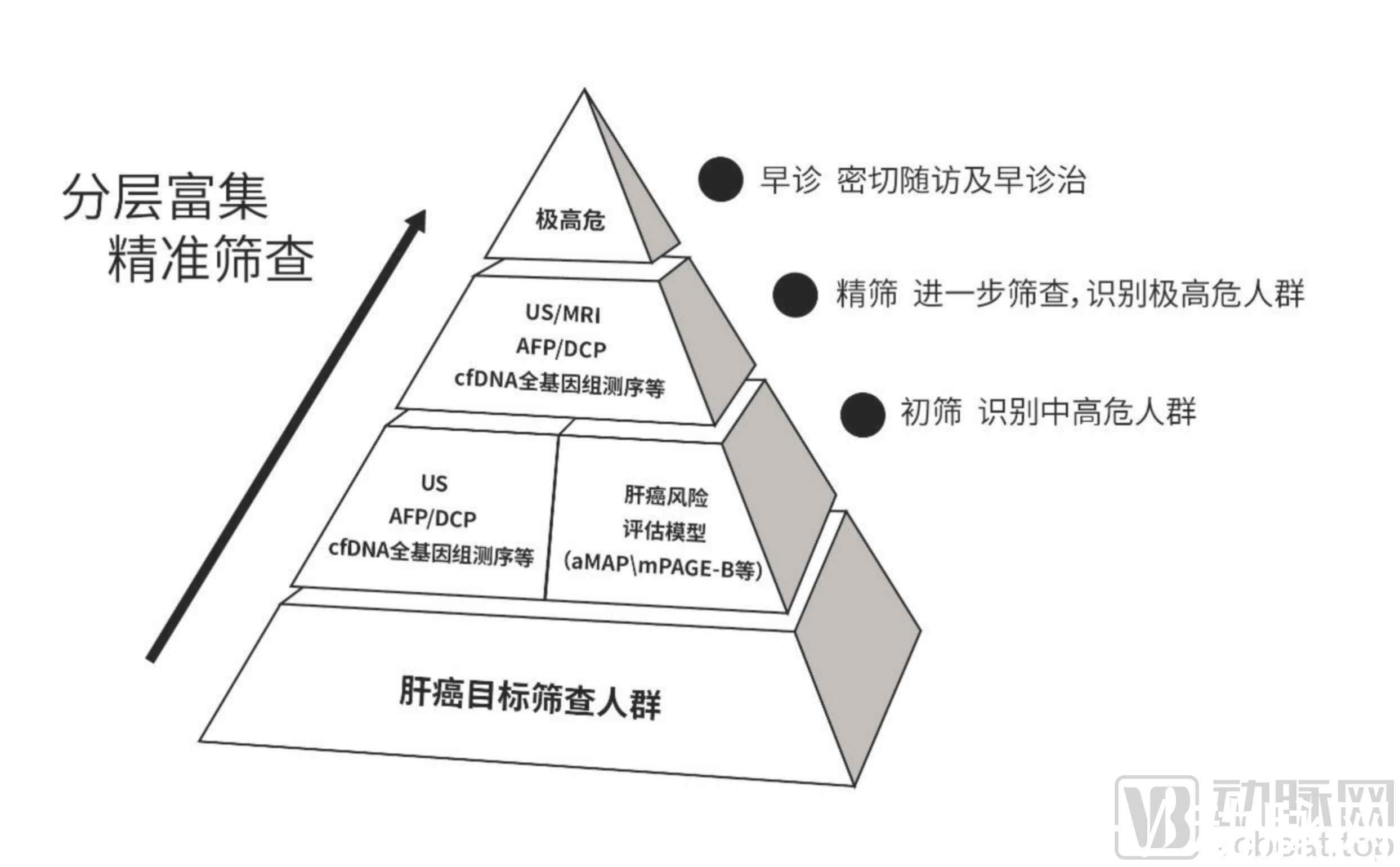 在《中国肝癌早筛策略专家共识》中,首次提出了建立“金字塔式分层筛查模式”,通过采用类似“金字塔”式的精准化分层筛查策略,逐层富集浓缩风险人群。